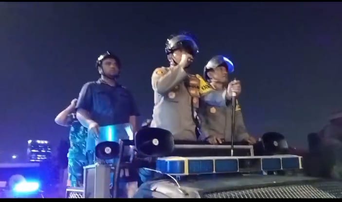 Kapolres Metro Jakarta Pusat, Kombes Pol Susatyo didampingi oleh Dandim 05/01 berada di garda terdepan guna mengimbau para peserta aksi untuk membubarkan diri dan kembali kerumah masing-masing. Kamis, (22/82024).