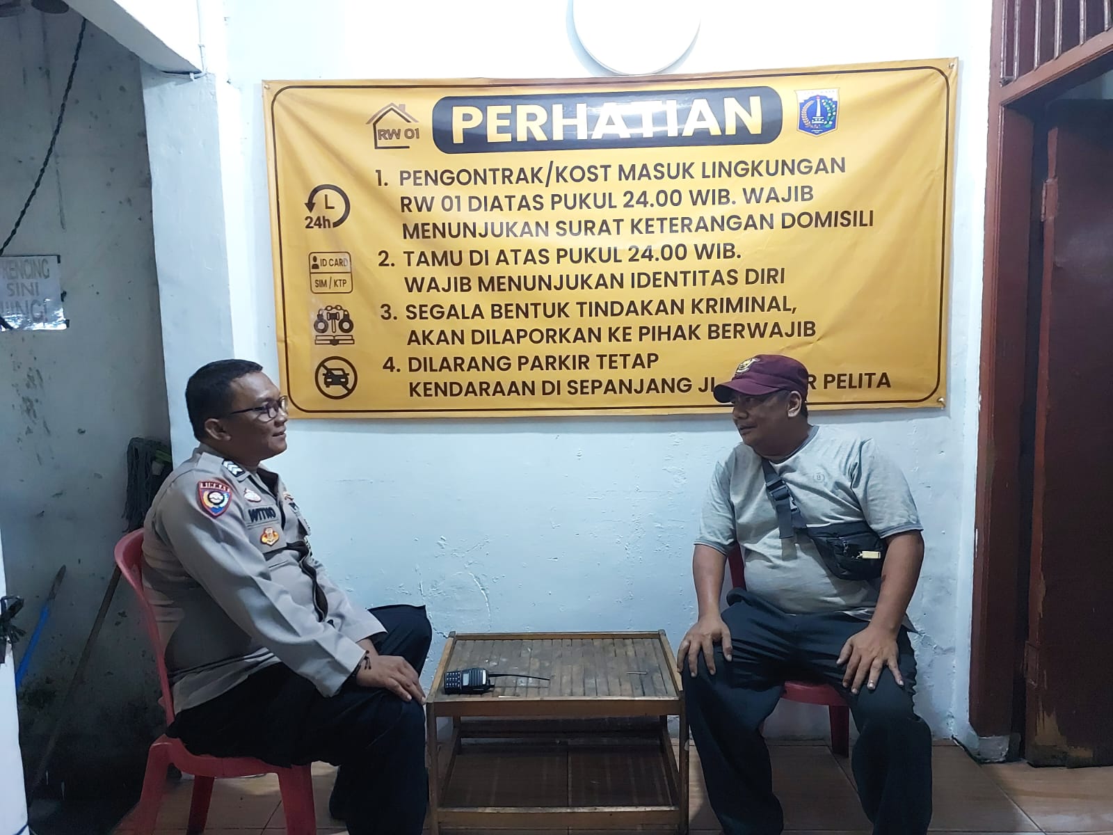Selanjutnya Brigadir Witno bertemu dengan Jaya dan Dedi selaku Awak Keamanan RW 01 memberikan himbauan terkait Kamtibmas serta mengajak bersinergi guna sama sama menjaga wilayah agar tetap aman dan kondusif.