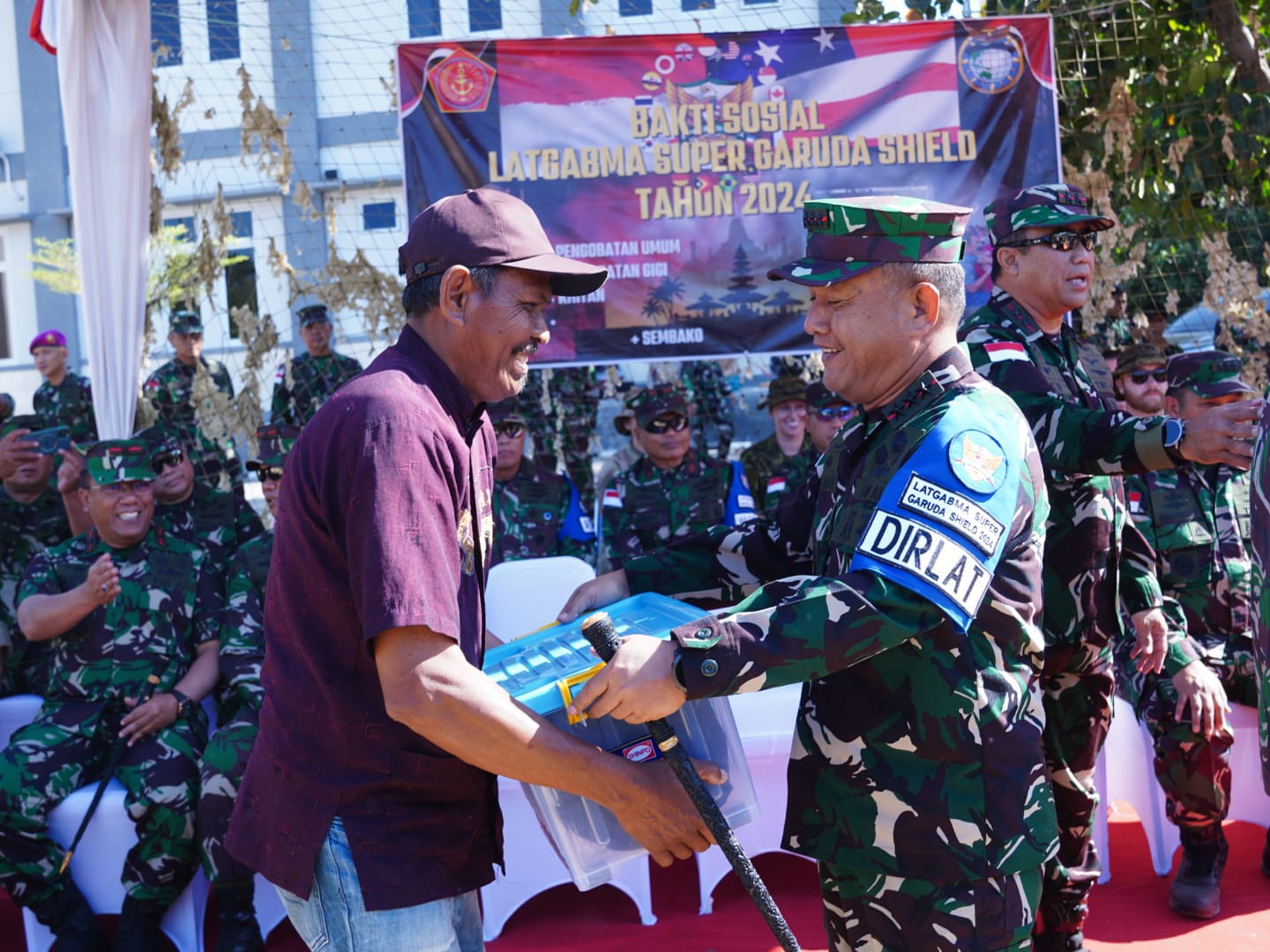 Komandan Detasemen Kesehatan pada Latgabma Super Garuda Shield 2024 Kolonel Laut (K) Dr. drg. Sudarmono, Sp. Ort., M.Tr.Opsla mengatakan kegiatan bakti sosial ini merupakan bagian dari latma Super Garuda Shield 2024 yang melibatkan ribuan masyarakat sekitar daerah latihan. “Bakti sosial yang digelar berupa pengobatan umum dengan menargetkan 500 pasien, sunatan masal 50 pasien dan pembagian sembako berupa kebutuhan pokok sebanyak 1000 paket,” ujar Kolonel Sudarmono.