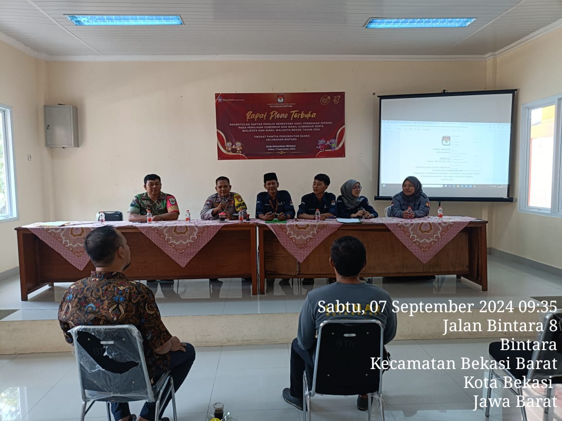 Rapat Pleno dihadiri oleh berbagai pihak terkait, termasuk Sekcam Bekasi Barat Bapak Nurdin, PPK Bekasi Barat, PPS Bintara, Panwaslu Kelurahan Bintara, Forum RW Kelurahan Bintara, dan Babinsa Kelurahan Bintara.