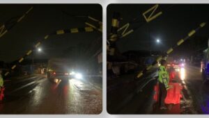 detikhukum.id, – BOGOR–Telah terjadi Laka tunggal kendaraan truk Trailer Pengangkut alat berat No.Pol : B 9310 TIP Muatan (Barang yang dibawa) menyangkut Portal pembatasan Oprasional Truk pengangkut Tambang sehingga mengalami kerusakan dan dampak kecelakaan tersebut menimpah pengendara sepeda motor honda blade No.Pol : B 3991 NKP Yang sedang melintas.