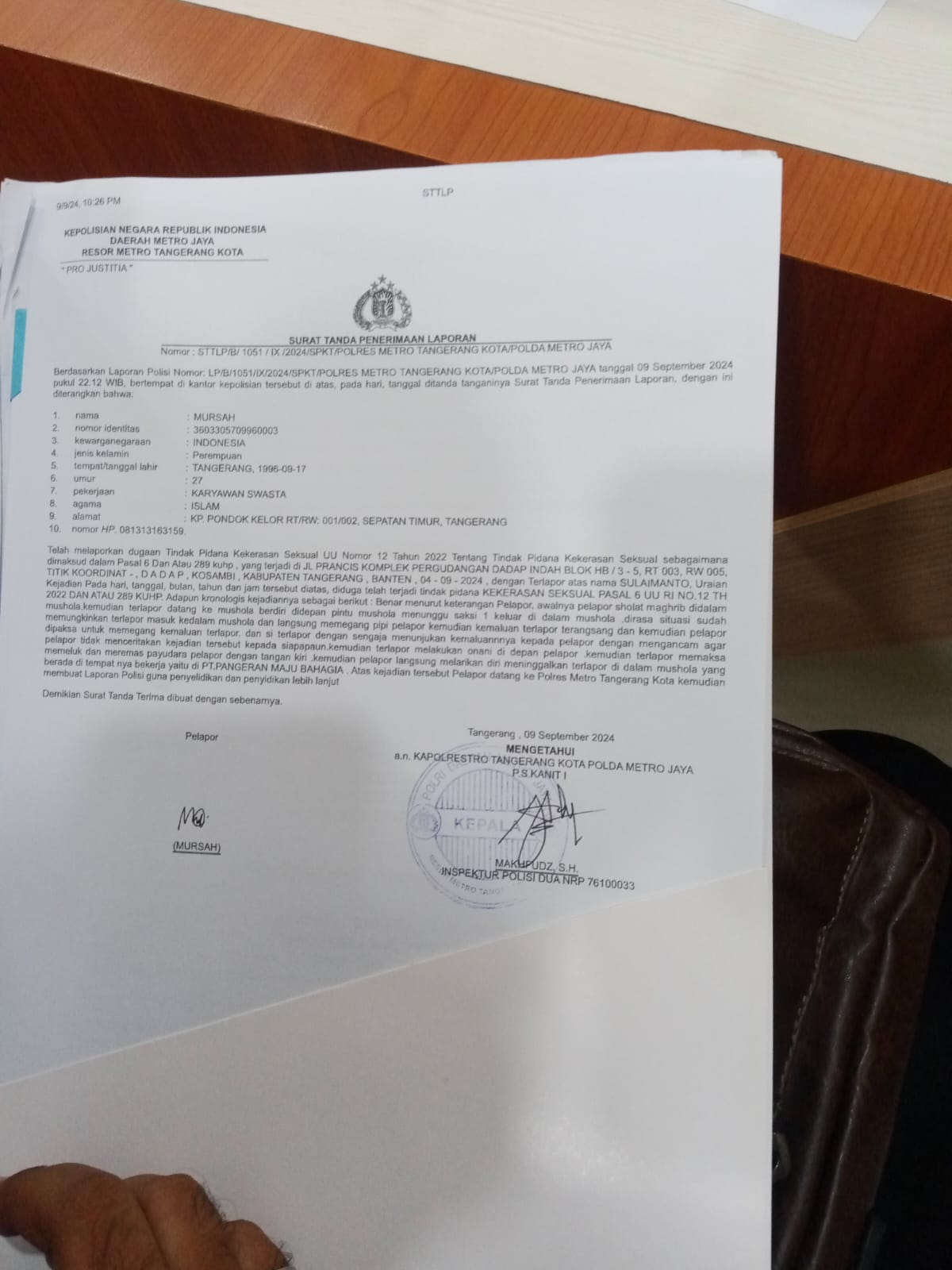 Berdasarkan surat laporan polisi nomor :LP/B/1051/IX/2025/SPKT/Polres Metro Tangerang kota,pada tanggal 09 September 2024 jam 22:11 wib .MH Resmi melaporkan Mandor tersebut ke Polres Metro Tangerang Kota Guna Mendapatkan Keadilan atas perbuatan pelecehan seksual yang ia alami.