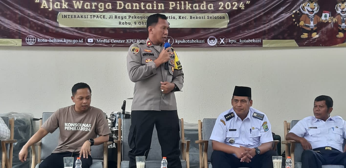 Kapolsek Bekasi Selatan Kompol Untung Riswaji menjadi narasumber pada kegiatan Ngopi Bareng oleh KPU Kota Bekasi. Kegiatan berlangsung di Interaksi Cafe, Jl. Raya Pekayon, kelurahan Jakasetia kecamatan Bekasi Selatan pada Rabu (09/10/24).