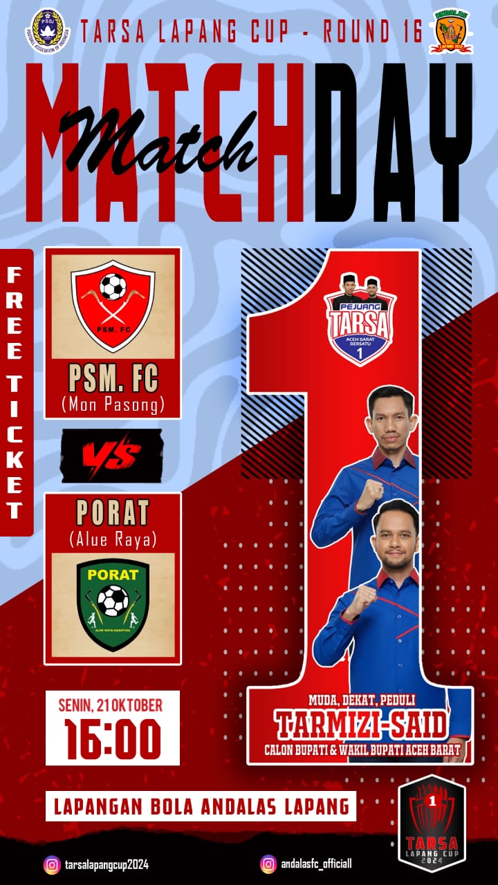 “besok laga antara PSM Monpasong FC yang akan berhadapan Porat Alue Raya di turnamen bola kaki semi open piala Tarmizi.,SP.,MM dan Saed Fadheil.,SH yang bertotalkan Rp 62 Jt. Dilaga tersebut Calon Bupati Aceh Barat Tarmizi dan Cawabup Aceh Barat Saed Fadheil dipastikan hadir mensaksikan langsung laga pertandingan itu.”jelas