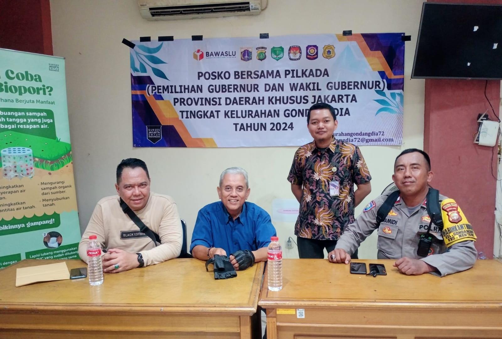 Bhabinkamtibmas Gondangdia, Aiptu Kamidi, bersama Tiga Pilar yang terdiri dari pihak TNI, Polri, dan Pemerintah Daerah, berkumpul di Posko Bersama Kelurahan Gondangdia, Menteng, Jakarta Pusat. Kehadiran mereka di posko ini bertujuan untuk memastikan terciptanya suasana pilkada yang aman, damai, dan kondusif. Sebagai representasi dari aparat keamanan, Tiga Pilar berperan penting dalam menjaga ketertiban dan keamanan masyarakat di tengah berlangsungnya proses pemilihan.