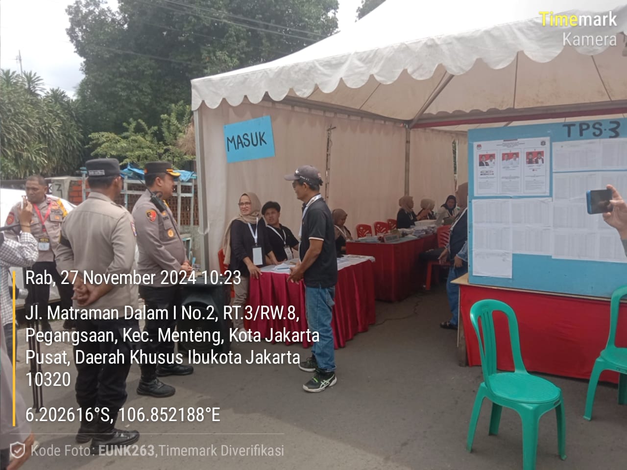 Pada hari pelaksanaan Pilkada DKI Jakarta, Kapolsek Metro Menteng, Kompol Bayu Marfiando, S.H., S.I.K., M.Si., melakukan pengecekan langsung di Tempat Pemungutan Suara (TPS) 31, RW 08, Kelurahan Pegangsaan, Kecamatan Menteng, Jakarta Pusat. Kehadiran beliau bertujuan untuk memastikan bahwa proses pemungutan suara berlangsung aman, tertib, dan kondusif sesuai dengan aturan yang berlaku.
