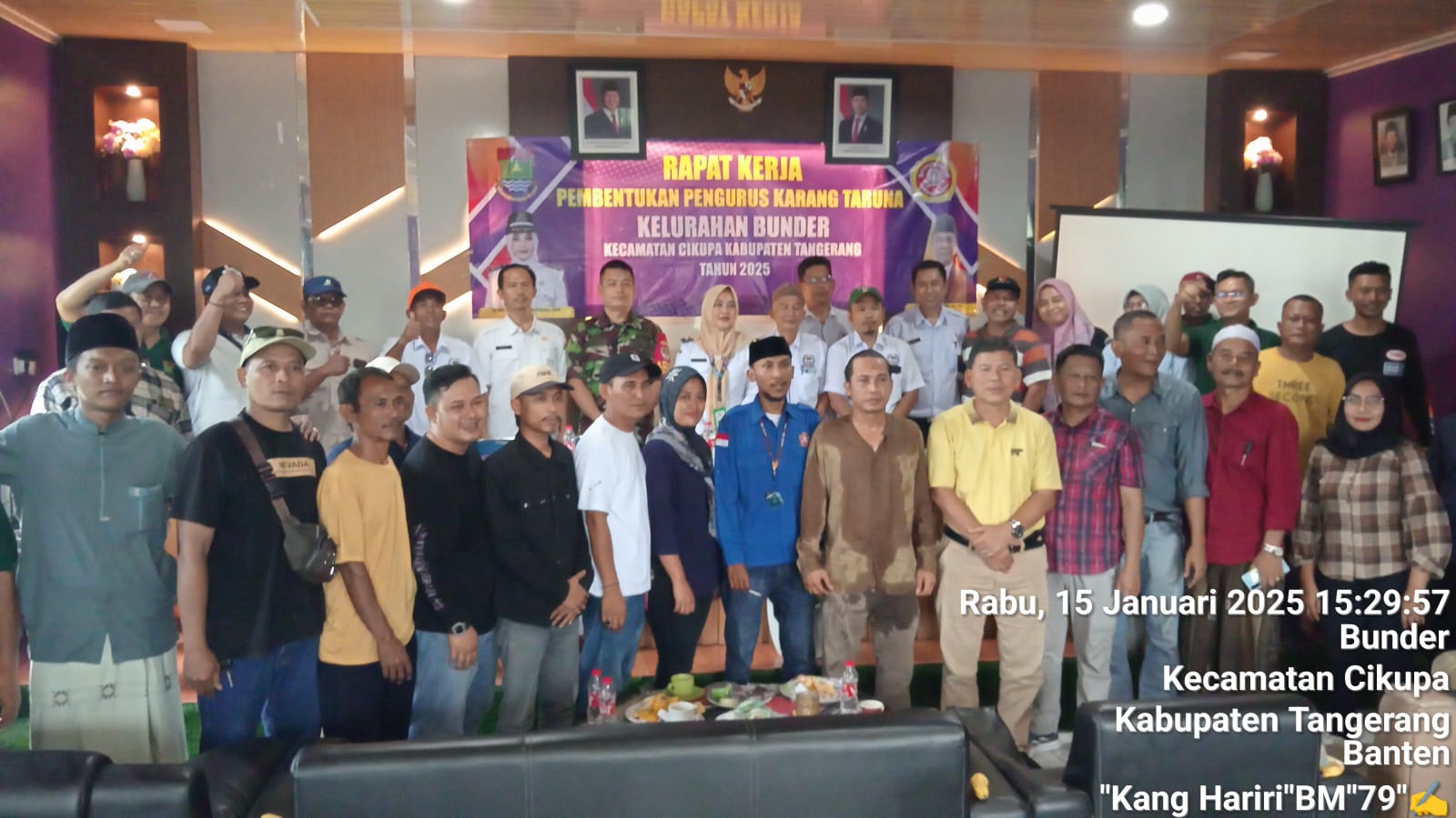 Dalam rangka berakhirnya masa jabatan kepungurusan karangtaruna Kelurahan Bunder Kecamatan Cikupa Kabupaten Tangerang Provinsi Banten Periode 2019-2024, Pemerintahan Kelurahan Bunder Adakan Rapat Kerja Pemilihan dan Pembentukan Pengurus Karangtaruna Periode Tahun 2025 s/d Tahun 2030, Acara berlangsung Mulai pukul 13.00 WIB s/d selesai di Aula Kantor Kelurahan Bunder Lantai 2 (dua), Rabu, 15/01/2025.