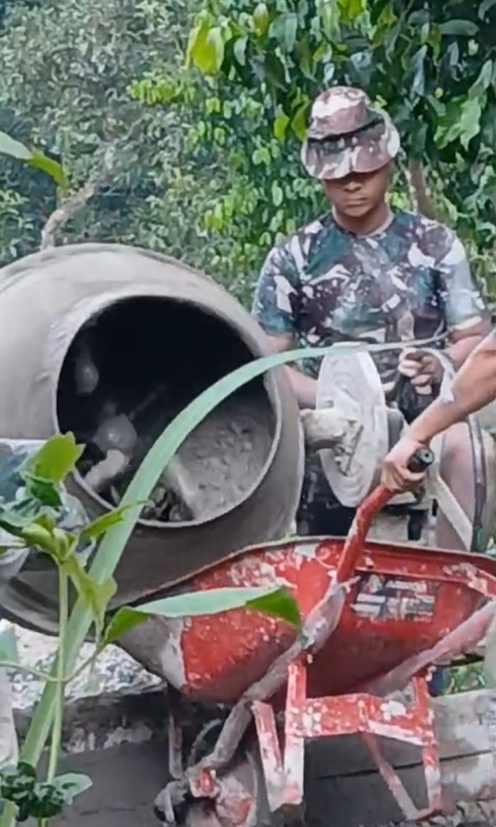 Tampak terlihat dilokasi TMMD, Prajurit TNI dan Masyarakat bahu membahu bekerja sama , ada yang membawa coran di ember secara berantai , ada yang menggendong semen dari mobil menuju lokasi, ada yang merapihkan coran dalam bekisting.