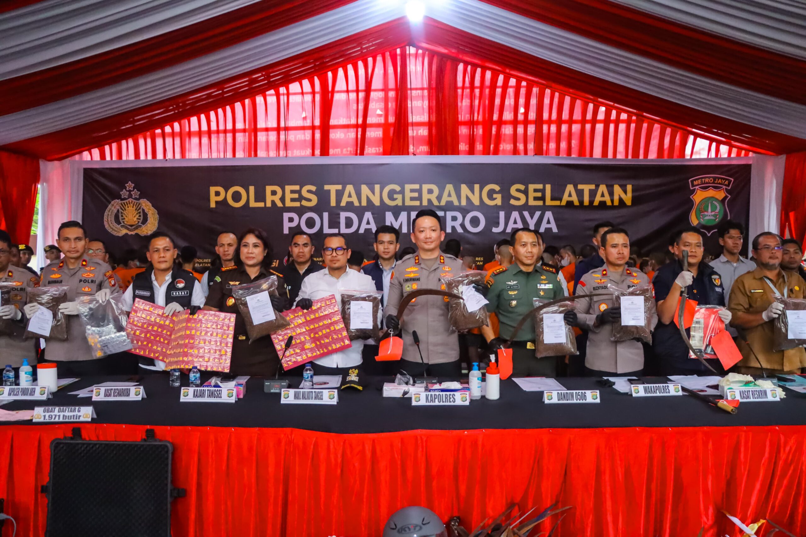 Kapolres Tangsel AKBP Viktor D.H. Inkiriwang, S.H, S.I.K, M.Si., menyampaikan hal tersebut dalam konferensi pers yang dihadiri oleh Forkopimda antara lain Wakil Walikota Tangerang Selatan H. Pillar Saga Ichsan, S.T., M.T., Kajari Kota Tangerang Selatan Apsari Dewi S.H., LL, M, PH. D., Dandim 0506 Tangerang Letkol Inf. Ary Sutrisno, S.I.P.