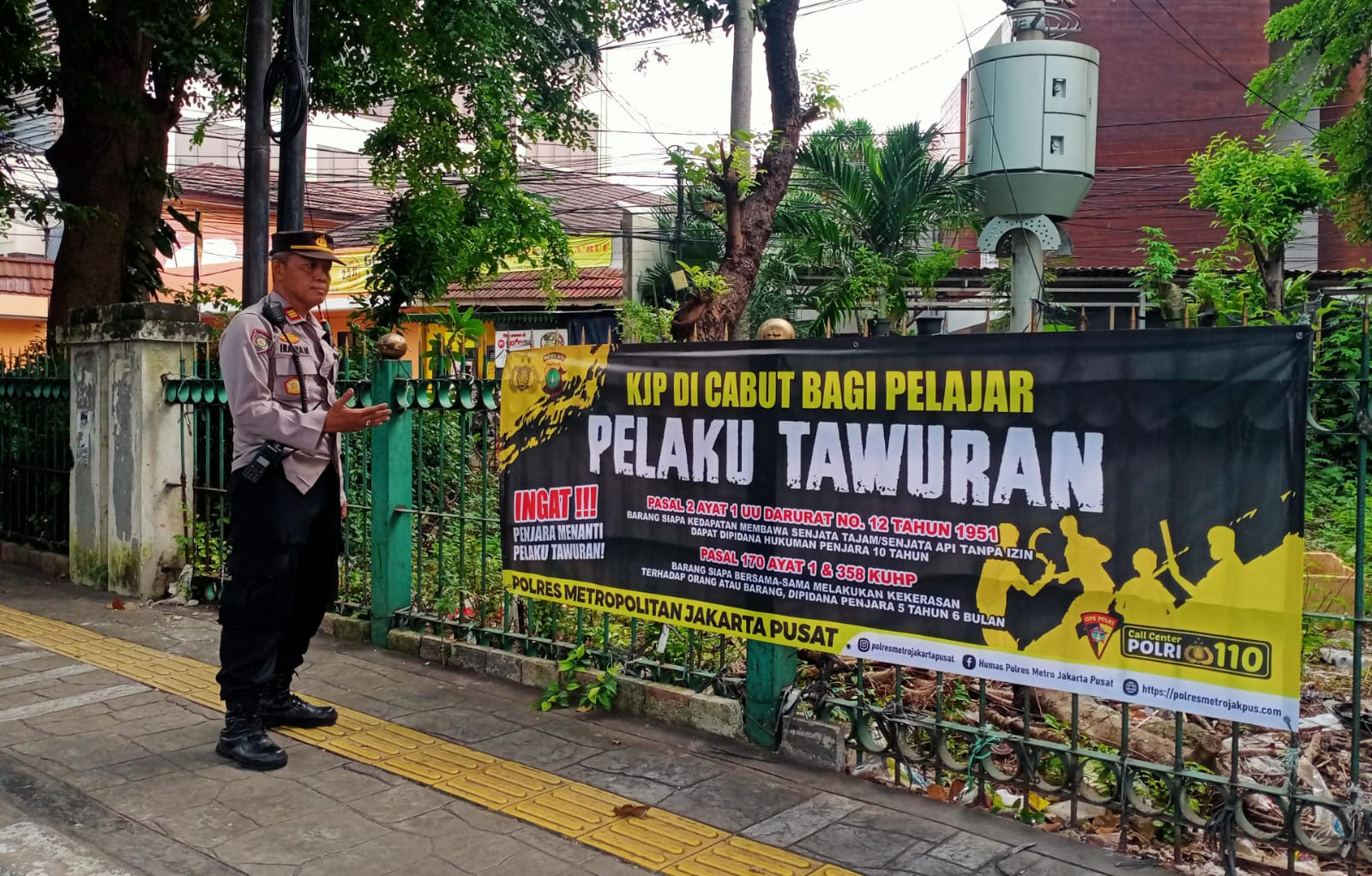 Dalam upaya menjaga keamanan dan ketertiban masyarakat (kamtibmas) di wilayah Gondangdia, Menteng, Jakarta Pusat, Kanit Binmas Polsek Metro Menteng AKP Irawan Junaedi, S.E, M.M bersama Bhabinkamtibmas Gondangdia Aiptu Kamidi melaksanakan kegiatan pemasangan spanduk himbauan kepada masyarakat. Kegiatan ini bertujuan untuk meningkatkan kesadaran warga terhadap pentingnya keamanan selama musim mudik, kewaspadaan terhadap bahaya kebakaran, serta mengajak masyarakat untuk menghentikan aksi tawuran yang meresahkan.