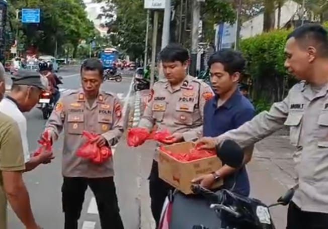 Wakapolsek Sawah Besar, AKP Tutuk Krisbianto, S.H., didampingi oleh anggota patroli, memimpin langsung pembagian takjil kepada para pengemudi bajaj, ojek online, dan pengguna jalan lainnya yang belum sempat membeli makanan untuk berbuka puasa.