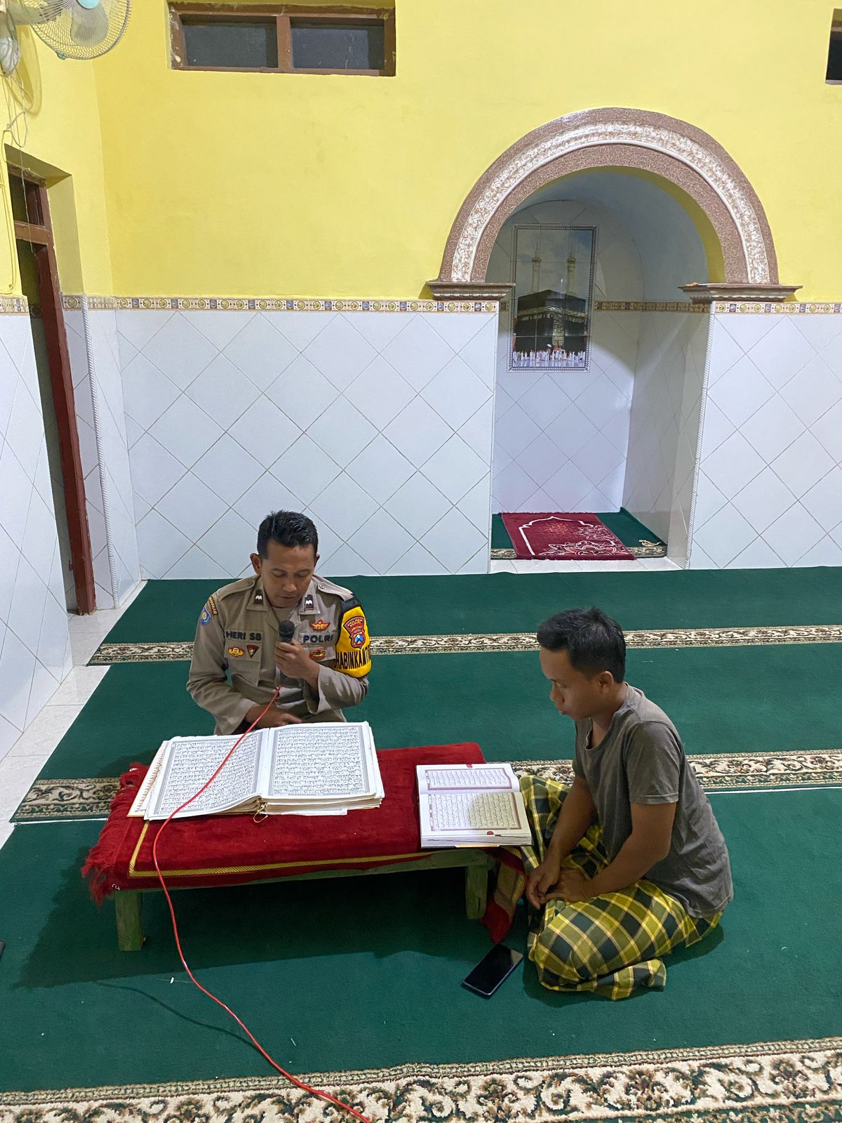 Sang Bhabinkamtibmas, yang biasanya berdiri tegap di tengah tugasnya menjaga ketertiban, kini duduk bersimpuh, jemarinya menyentuh lembaran mushaf, mengikuti bacaan dengan penuh khidmat..