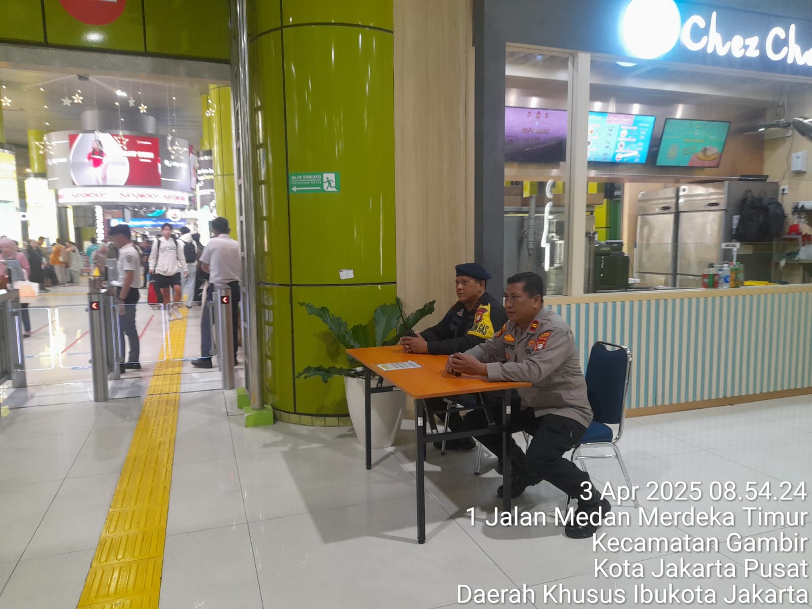 Pengamanan ini dipimpin oleh Iptu Sucipto selaku Kepala Pos Pengamanan Monas Timur, didampingi oleh Bripda Kukuh dari unit patroli. Kehadiran aparat kepolisian di lokasi bertujuan untuk menjaga ketertiban, membantu pengaturan arus penumpang, serta memberikan rasa aman dan nyaman bagi masyarakat yang hendak berangkat maupun tiba di stasiun.