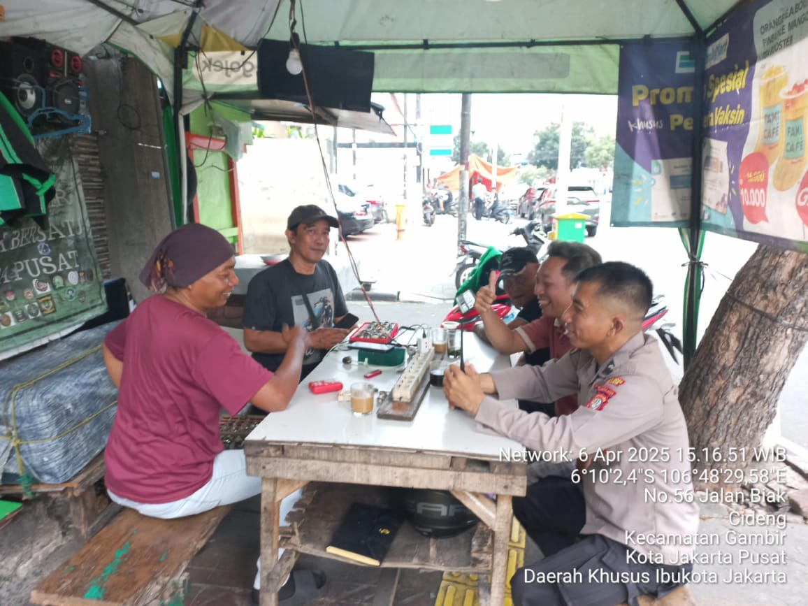 detikhukum.id, || Jakarta Pusat – Guna menjaga kondusivitas wilayah serta mencegah potensi gangguan kamtibmas dan aksi kejahatan jalanan, jajaran Polsek Metro Gambir kembali melaksanakan patroli dan sambang wilayah. Senin, 7 April 2025, anggota Polsubsektor Roxy Aipda Zaenal Arifin melakukan sambang ke pangkalan ojek online (ojol) di Jl. Biak, Kelurahan Cideng, Kecamatan Gambir, Jakarta Pusat.