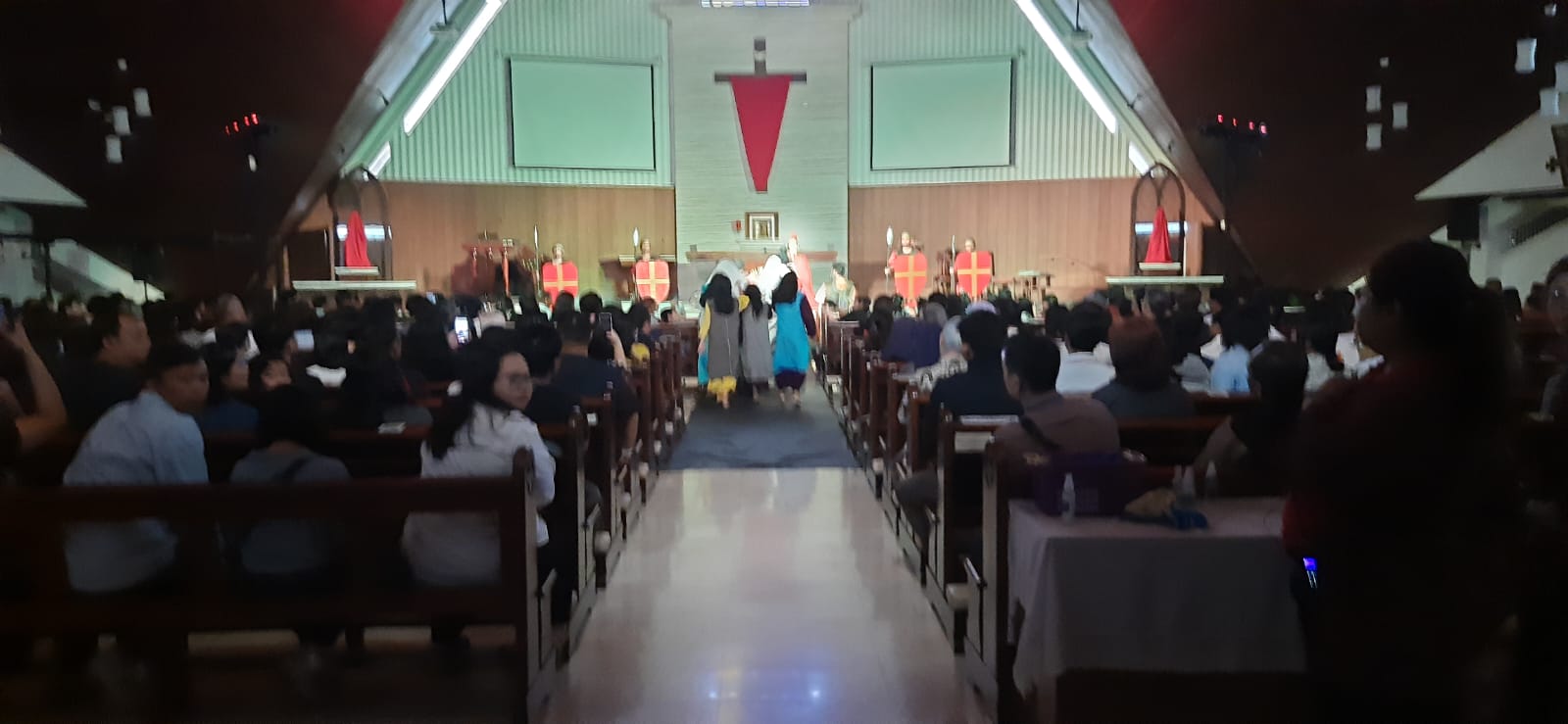 Sekitar 200 jemaat hadir dalam misa pertama yang dimulai pukul 08.00 WIB dan dipimpin oleh Romo Aldo dengan tema Tablo Jalan Salib. Suasana ibadah berlangsung khidmat dan tertib.