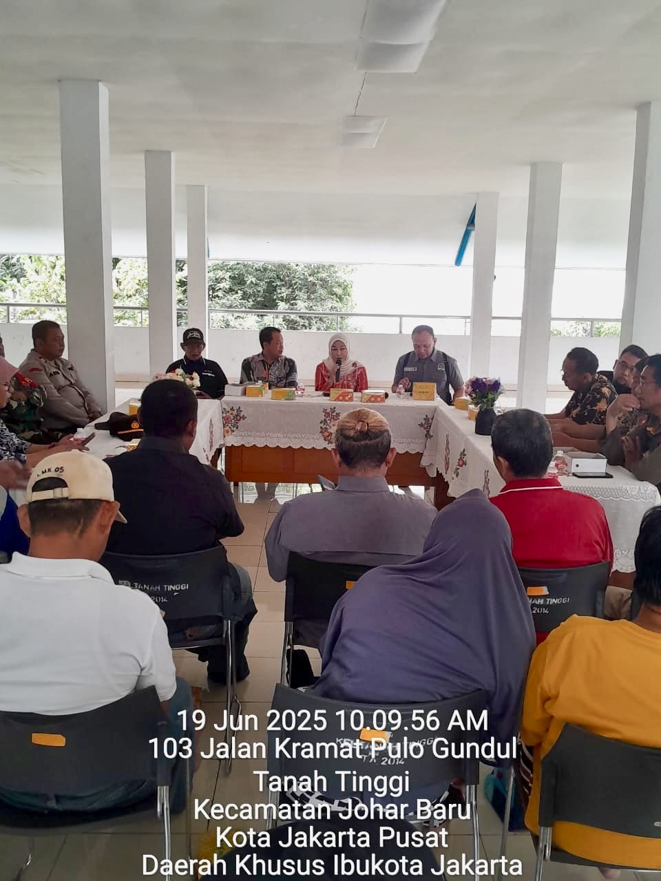 Rapat dihadiri oleh berbagai unsur terkait, termasuk Kabag Hukum Kota Administrasi Jakarta Pusat, Lurah Tanah Tinggi, Kasi Pemerintahan Kecamatan Johar Baru, Wakapolsek Johar Baru AKP Aris Setiawan, Babinsa, Bhabinkamtibmas, Satpol PP, LMK, Ketua RW 013, serta perwakilan warga yang terdampak langsung.