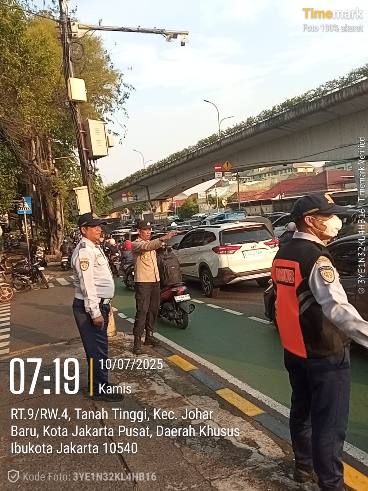 detikhukum.id, || Jakarta Pusat — Dalam rangka menciptakan kelancaran arus lalu lintas serta mencegah tindak kejahatan jalanan, Kapolsubsektor Tanah Tinggi Aiptu Antonius Andi Wibowo bersama petugas Dinas Perhubungan (Dishub) melaksanakan kegiatan pengaturan lalu lintas (gatur lalin) di kawasan padat kendaraan, tepatnya di Traffic Light Galur, Jalan Letjen Suprapto, Kelurahan Tanah Tinggi, Kecamatan Johar Baru, pada Kamis, 10 Juli 2025 pukul 07.00 WIB hingga selesai.