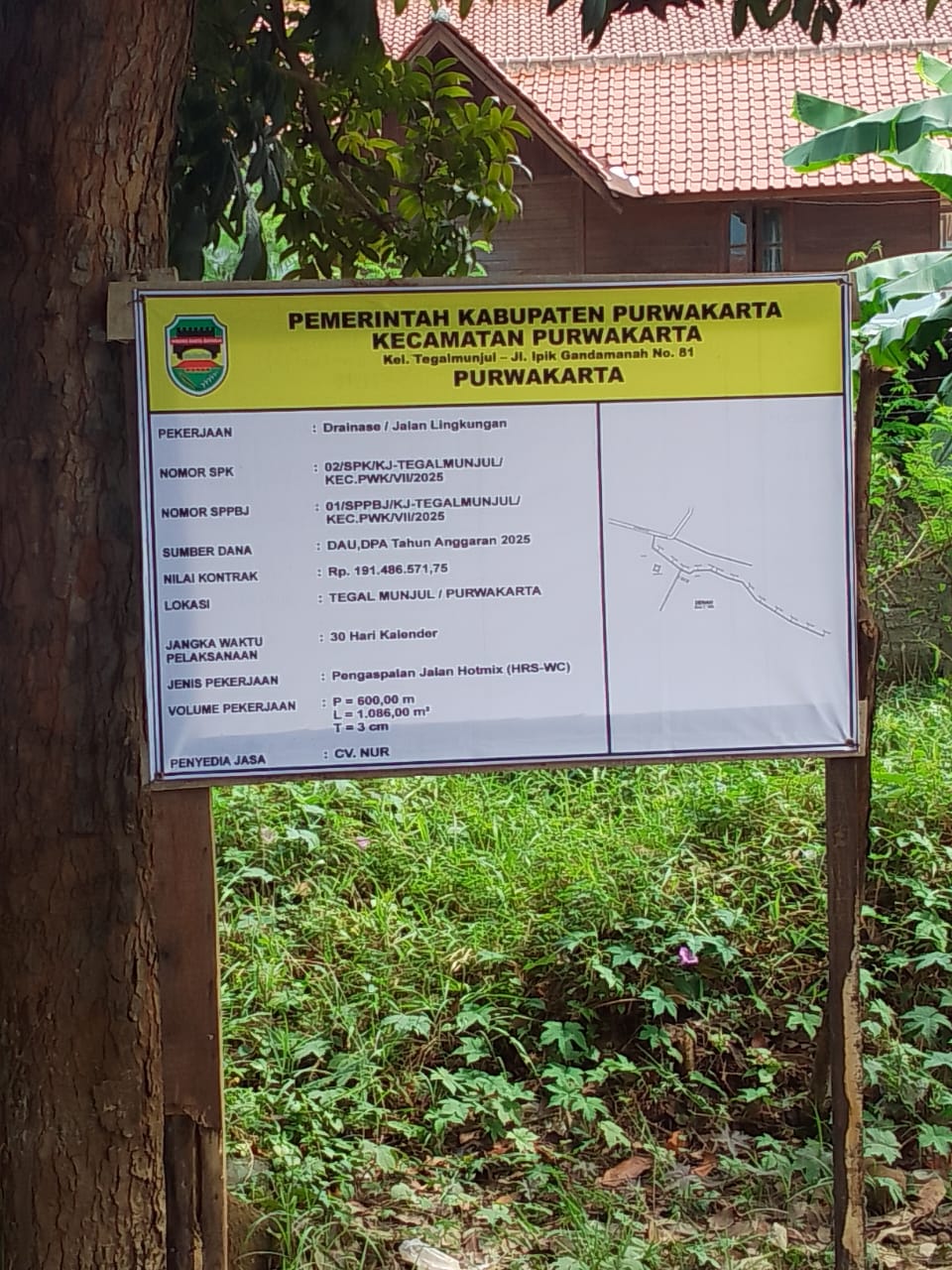 detikhukum.id || Purwakarta – Proses pengerjaan Drainase/Jalan Lingkungan yang sedang berjalan di kelurahan Tegal Munjul tidak transparansi , bahwa papan plang tidak jelas. Menurut narasumber (yang tidak ingin disebut namanya) bahwa plang sudah terpasang tapi pengerjaan tersebut belum dilakukan , terlihat dari papan plang bahwa proses pengerjaan tidak tertera dari awal mulai sampai selesainya dan tertulis di plangnya hanya 30 hari kalender , dari hal ini di duga bahwa pengerjaan tidak transparan dan nama CV yang tertera di papan plang tidak jelas alamat kantornya dan nomor kontak yang dapat dihubungi , jadi besar kemungkinan CV ini adalah CV siluman.
