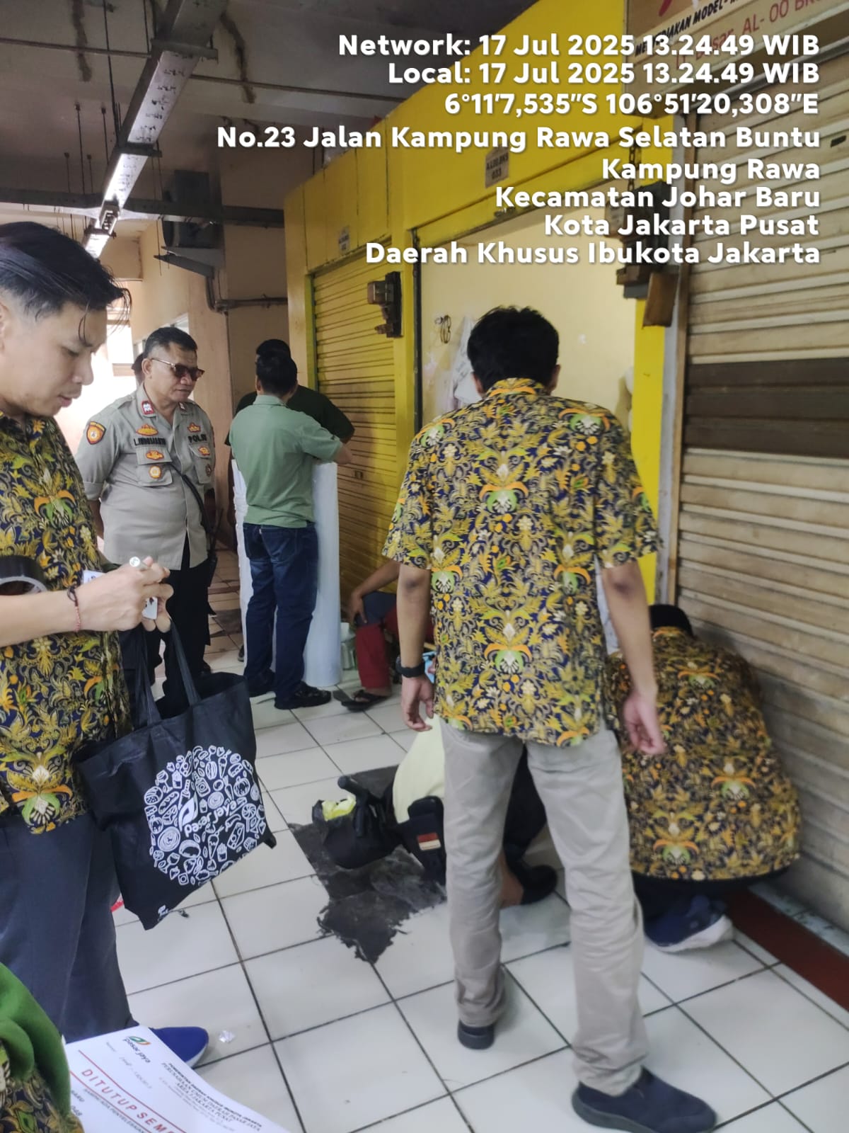 Dalam kegiatan tersebut, Aiptu Lukas bergabung bersama Kepala Pasar Johar Baru, Bapak Eko beserta jajaran staf pasar untuk memantau langsung proses penempelan stiker penutupan sementara pada sejumlah kios. Pendampingan ini dilakukan sebagai bentuk antisipasi terhadap potensi gesekan atau gangguan yang dapat mengganggu ketertiban umum.