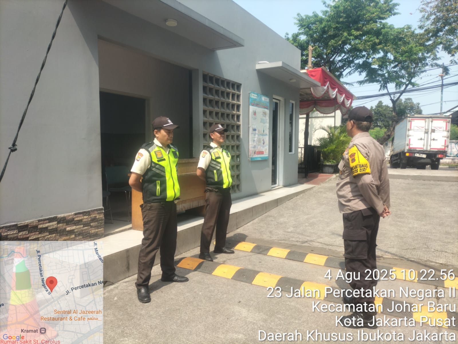 detikhukum.id, || Jakarta Pusat – Guna menjaga situasi tetap aman dan kondusif serta mencegah potensi gangguan kamtibmas di area vital, Aiptu Sunarto, Bhabinkamtibmas Kelurahan Johar Baru, melaksanakan kegiatan cooling system dan patroli sambang lingkungan ke Gedung Pergudangan Kementerian Kesehatan RI, yang berlokasi di Jl. Percetakan Negara II, RW 07, Kelurahan Johar Baru, Kecamatan Johar Baru, Jakarta Pusat, pada Senin, 4 Agustus 2025 pukul 11.00 WIB.