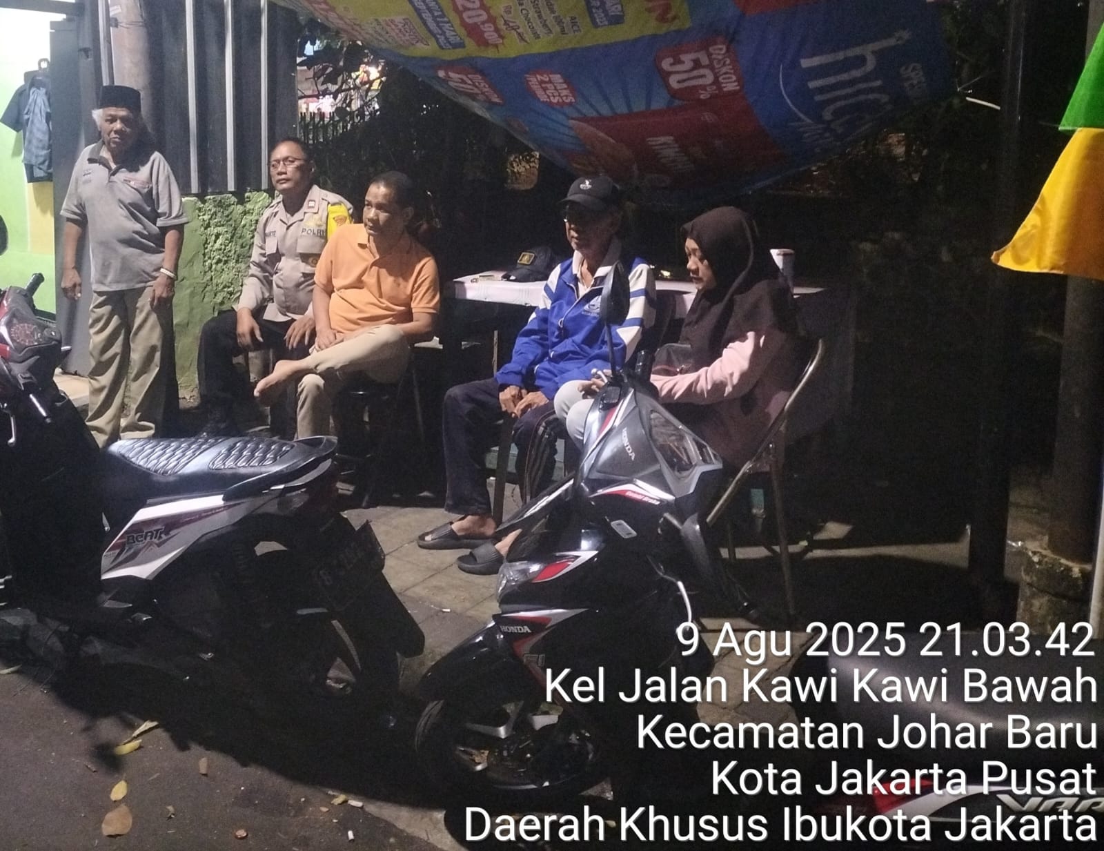 detikhukum.id, || Jakarta Pusat – Untuk menjaga situasi keamanan dan ketertiban masyarakat (kamtibmas) tetap kondusif, Bhabinkamtibmas Kelurahan Johar Baru, Aiptu Sunarto, melaksanakan patroli dialogis dan sambang wilayah disertai kegiatan cooling system di Jalan Kawi-Kawi Bawah RW 08, Kelurahan Johar Baru, Jakarta Pusat, Sabtu (9/8/2025) malam.