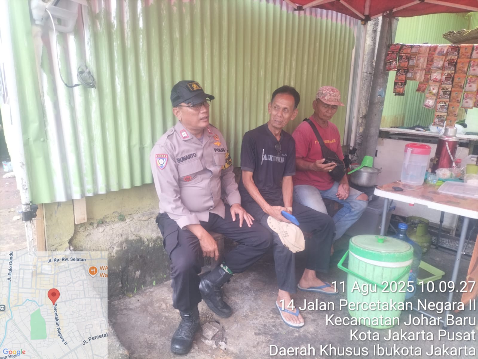 detikhukum.id, || Jakarta Pusat – Dalam rangka menciptakan situasi aman dan kondusif di lingkungan masyarakat, Bhabinkamtibmas Kelurahan Johar Baru Aiptu Sunarto melaksanakan patroli dialogis dan sambang door to door ke wilayah RW 06, Kelurahan Johar Baru, pada Senin (11/8/2025) pukul 10.15 WIB.