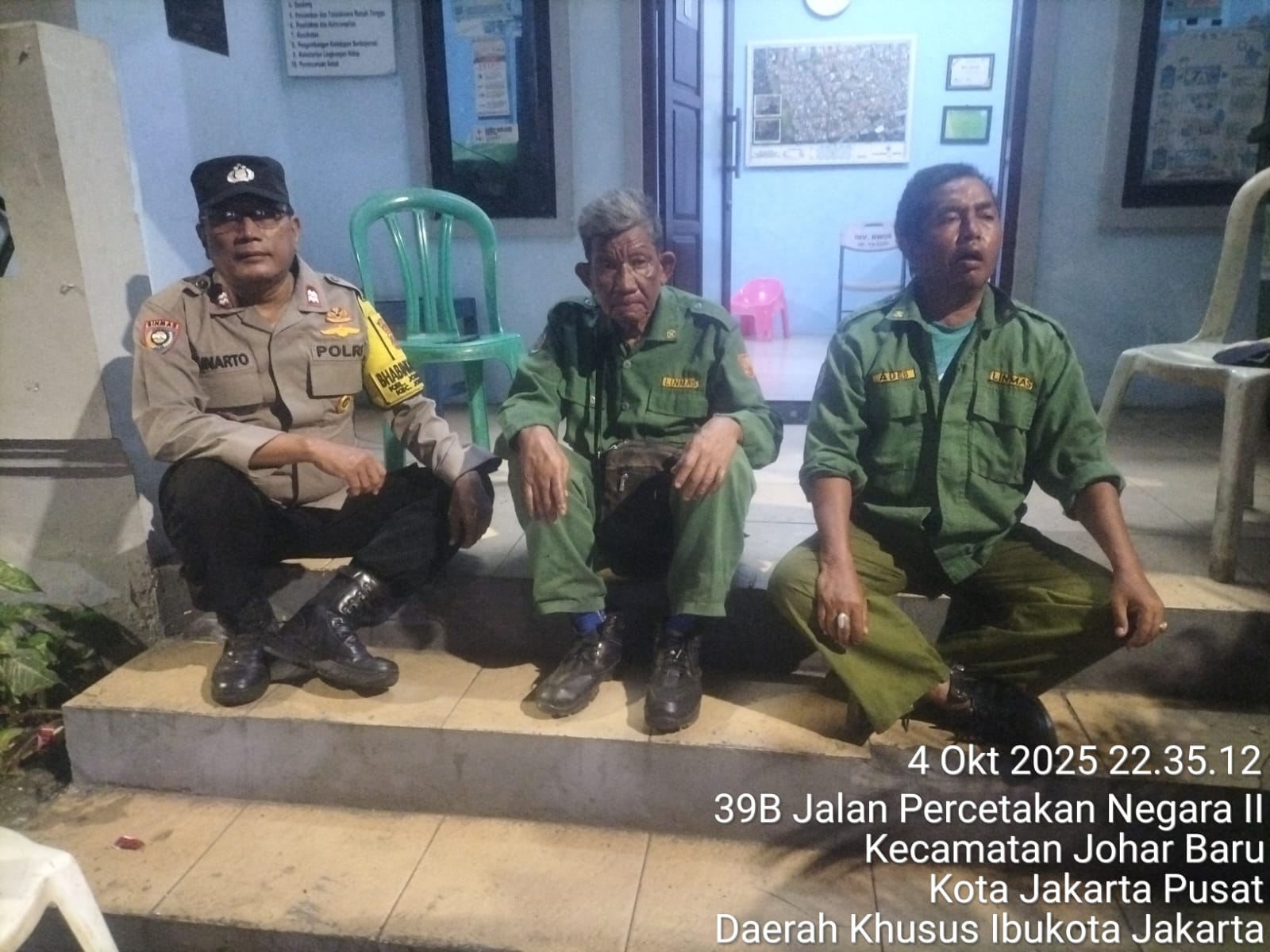 detikhukum.id, || Jakarta Pusat – Untuk menjaga situasi keamanan dan ketertiban masyarakat pada malam hari, Bhabinkamtibmas Kelurahan Johar Baru, Aiptu Sunarto, melaksanakan patroli dialogis dan sambang poskamling di wilayah RW 06 Kelurahan Johar Baru, pada Minggu dini hari (5/10/2025), pukul 00.25 WIB.