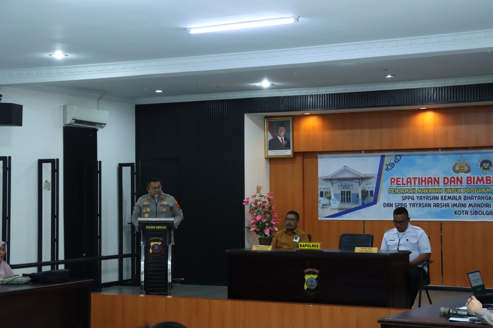 Acara dimulai dengan pembukaan oleh pembawa acara dan dilanjutkan dengan pembacaan doa sebagai bentuk rasa syukur dan harapan kelancaran kegiatan. Sambutan hangat disampaikan oleh Kapolres Sibolga, AKBP Eddy Inganta, yang menekankan pentingnya edukasi bagi para penjamah makanan sebagai garda terdepan dalam menjamin kesehatan konsumsi anak-anak sekolah, khususnya dalam program makanan bergizi gratis.