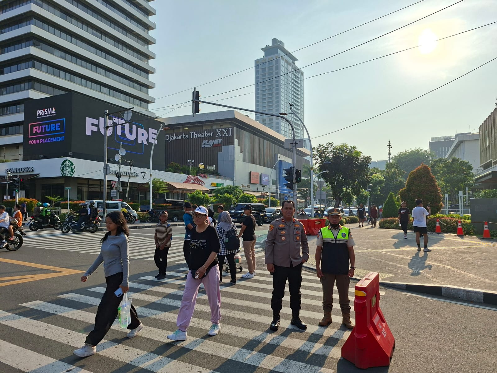 Selain pengamanan di area utama, petugas Polsek Metro Menteng bersama unsur pengamanan gabungan juga melakukan pemantauan arus kendaraan di sekitar kawasan Thamrin dan Wahid Hasyim untuk mencegah kemacetan sekaligus memastikan keselamatan warga yang melintas.