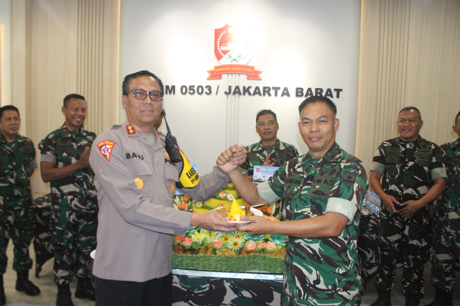 Dengan membawa kue ulang tahun dan Nasi Tumpeng, rombongan Polres Jakbar disambut hangat oleh jajaran TNI Kodim 0503 JB.
