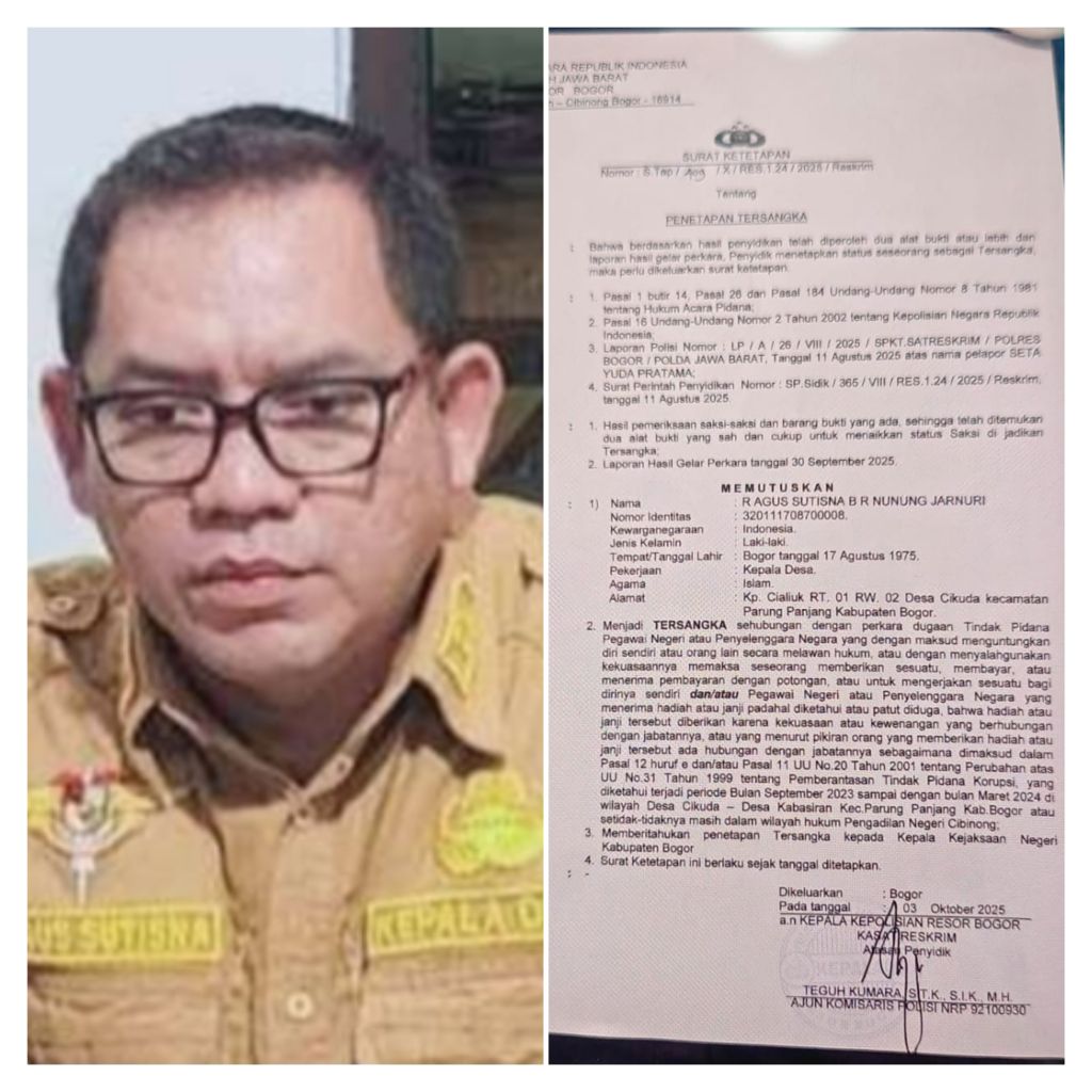 detikhukum.id, || KAB. BOGOR– Status hukum Kepala Desa Cikuda, Kecamatan Parung Panjang, Kabupaten Bogor, R. Agus Sutisna, resmi dinaikkan dari saksi menjadi tersangka oleh Satuan Reserse Kriminal (Satreskrim) Polres Bogor. Kamis (09/10/2025)
