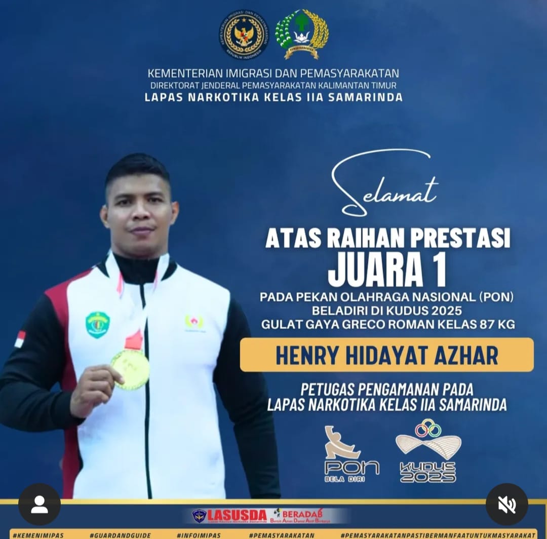 detikhukum.id, || Samarinda – Prestasi membanggakan kembali ditorehkan oleh aparatur sipil negara di lingkungan Kementerian Hukum dan HAM. Petugas Lapas Narkotika Kelas IIA Samarinda, Henry Hidayat Azhar, berhasil meraih medali emas pada ajang Pekan Olahraga Nasional (PON) 2025 yang digelar di Kudus, Jawa Tengah.13 /10/2025