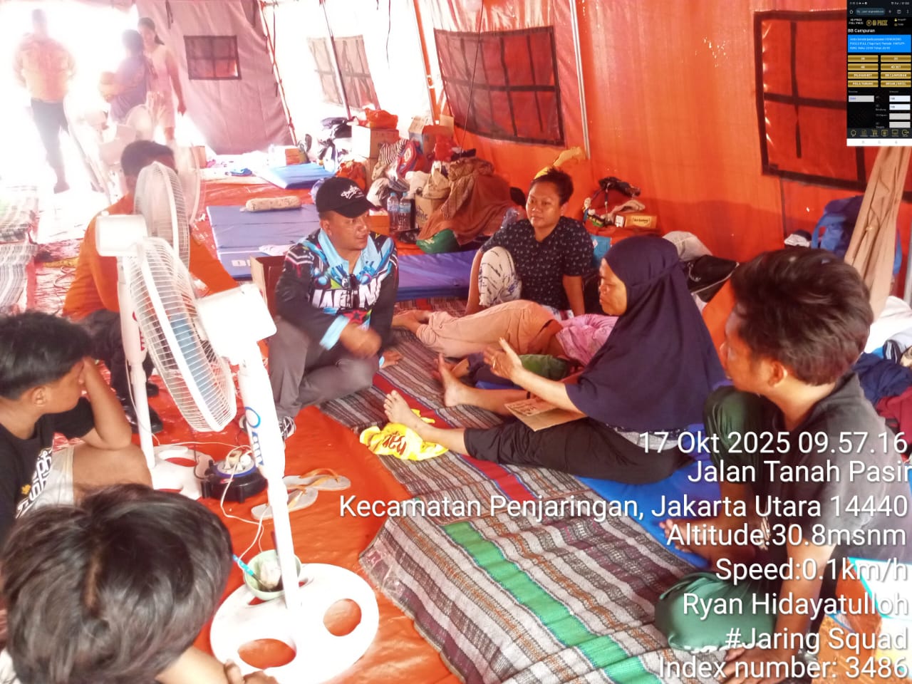 detikhukum.id,- Lurah Penjaringan Makrus Nugroho Drajat meninjau kembali korban kebakaran Rw.010 Penjaringan ke tenda darurat BPBD tempat Korban berteduh dan menginap bersama korban kebakaran lainnya serta memberikan edukasi juga menyemangati kembali kepada (Penyintas) masyarakat yang mengalami dan terkena dampak dari kejadian bencana dikarenakan masa tanggap darurat akan berakhir pada sabtu 18 Oktober 2025 siang besok