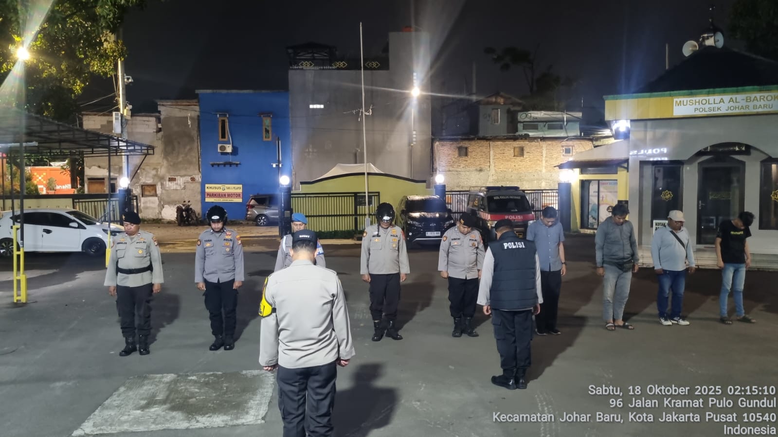 detikhukum.id,- Jakarta Pusat – Wakapolsek Johar Baru, AKP Aris Setyawan, memimpin apel Patroli Cipta Kondisi Antisipasi Guantibmas pada Sabtu (18/10/2025) pukul 02.05 WIB di halaman Polsek Johar Baru. Apel diikuti oleh 15 personel Polsek Johar Baru dan didampingi Padal Aiptu Sonny A.S. (Panit II Opsnal Reskrim).
