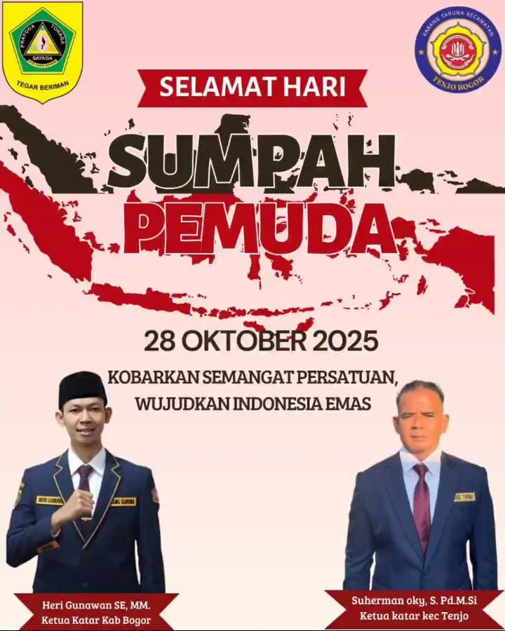 Suherman Oki Ketua Karangtaruna Kecamatan Tenjo mengucapkan selamat Hari Sumpah Pemuda ke-97, menjunjung semangat perubahan menuju bangsa Indonesia yang lebih makmur dan sejahtera melalui semangat generasi muda.kamipun karangtaruna Sekecamatan Tenjo selalu menggali potensi bagi para pemuda terutama dalam bidang sosial dan olahraga, diwilayah kecamatan Tenjo ini banyak para pemuda yang berbakat dan berprestasi dalam bidang pendidikan maupun olahraga,dimana kami para karangtaruna kecamatan Tenjo juga para anggota karangtaruna di sembilan desa selalu mensupport berbagai macam kegiatan yang bermanfaat, saya ucapkan selamat hari sumpah pemuda ke 97, generasi para pemuda wajib mengembangkan bakat dan potensi,”