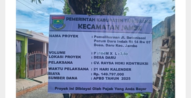 Seperti pembangunan betonisasi yang sedang direalisasikan diperumahan daru indah RT.14/07 Desa Dari Kecamatan Jambe kabupaten Tangerang,bersumber dari APBD 2025 dengan jumlah Rp. 149.797.000,dengan CV Raysa Hoki Kontruksi.
