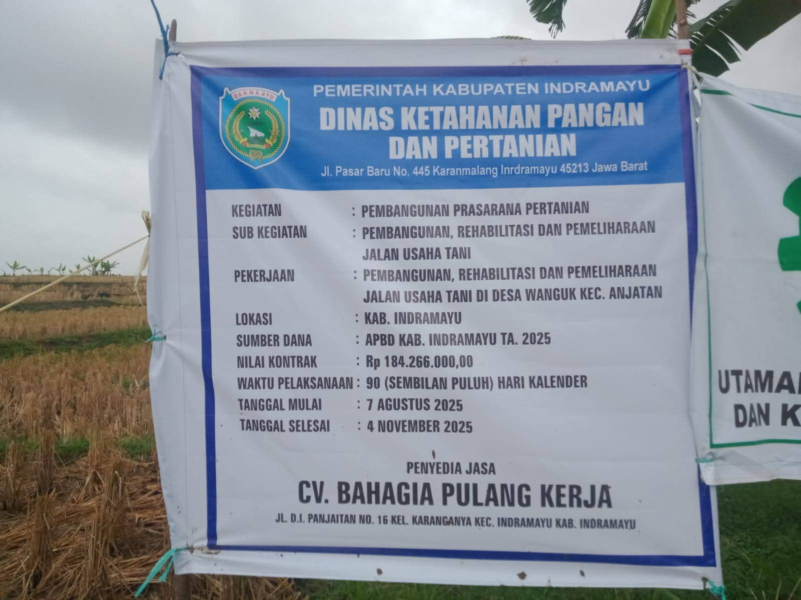 Pembangunan proyek rehabilitasi jalan usaha tani cor beton untuk sarana dan prasarana pertanian yang terdapat didesa wanguk kecamatan Anjatan Kabupaten Indramayu yang diselenggarakan oleh pemerintah Indramayu melalui Dinas Ketahanan Pangan dan Pertanian (DKPP) untuk Pembangunan Rehabilitasi Cor Beton Jalan Usaha Tani yang didanai dari Anggaran Pendapatan Belanja Daerah (APBD) Kabupaten Indramayu, dengan Nilai kontrak Rp 184.266.000,- dan waktu pelaksanaan 90 hari kalender dari tanggal mulai 7 Agustus 2025 sampai 4 November 2025 dengan penyedia jasa CV Bahagia Pulang Kerja Jl.D.I Panjaitan No 16 kelurahan Karang anyar kecamatan Indramayu kabupaten Indramayu.