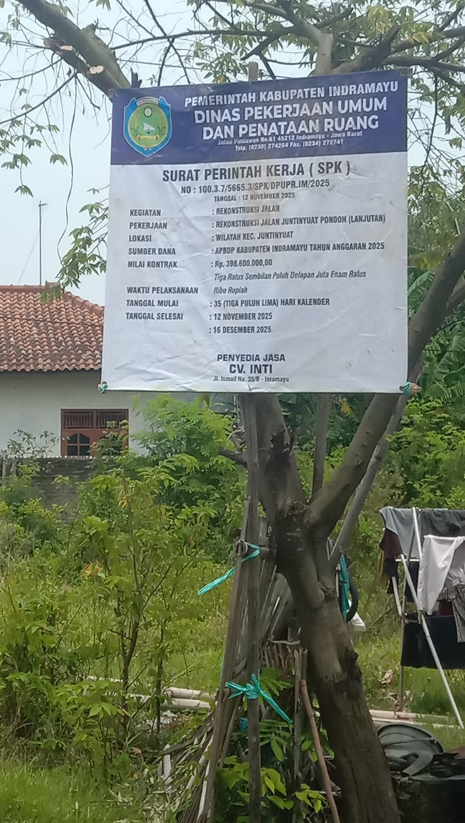 Rekonstruksi jalan ini dengan Volume panjang 165 meter dengan lebar 4.5 meter dan tingginya 0.20 meter, dengan penyedia jasa CV INTI jl.ismail no 35/B Indramayu dan waktu pelaksanaan dimulai 12 November 2025 sampai 16 Desember 2025 (35 hari kalender ) sumber dana dari APBDP Kabupaten tahun anggaran 2025 dengan nilai Rp 398.600.000,- dengan Nomer SPK (Surat Perintah Kerja) no.100.3.7/5665.3/SPK/DPUPR. IM/2025.