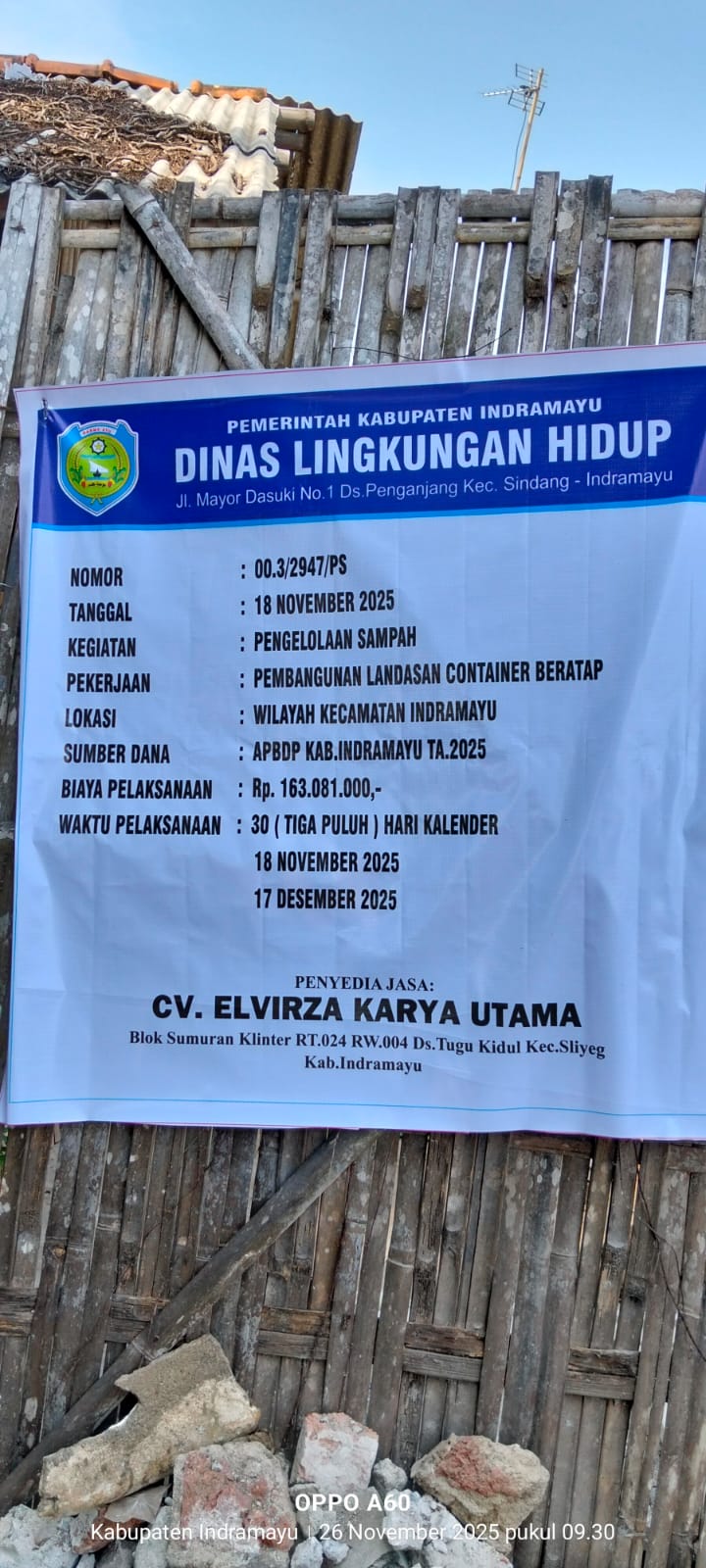 Bangunan Landasan TPS Countainer Beratap ini dibangun dengan Dana Anggaran Pendapatan Belanja Daerah (APBD) Tahun Anggaran 2025 dengan landasan cor beton ,sampingnya dibangun tembok bata dengan tinggi 2 meter, panjang 7 meter , lebar 6 meter, dengan nilai kontrak Rp 163.081.000,- dikerjakan selama 30 hari kalender dari mulai tanggal 18 november 2025 sampai 17 desember 2025 dengan penyedia jasa atau kontraktor CV Elvirza karya utama Blok sumuran klinter rt 24 rw 04 desa tugu Kidul kecamatan sliyeg kabupaten Indramayu dan atasnya dikasih atap baja ringan biar sampah yang ada di TPS itu tetap kering biarpun cuaca hujan dan disediakan Countainer mobil sampah buat pergantian pengangkutan sampah tersebut.