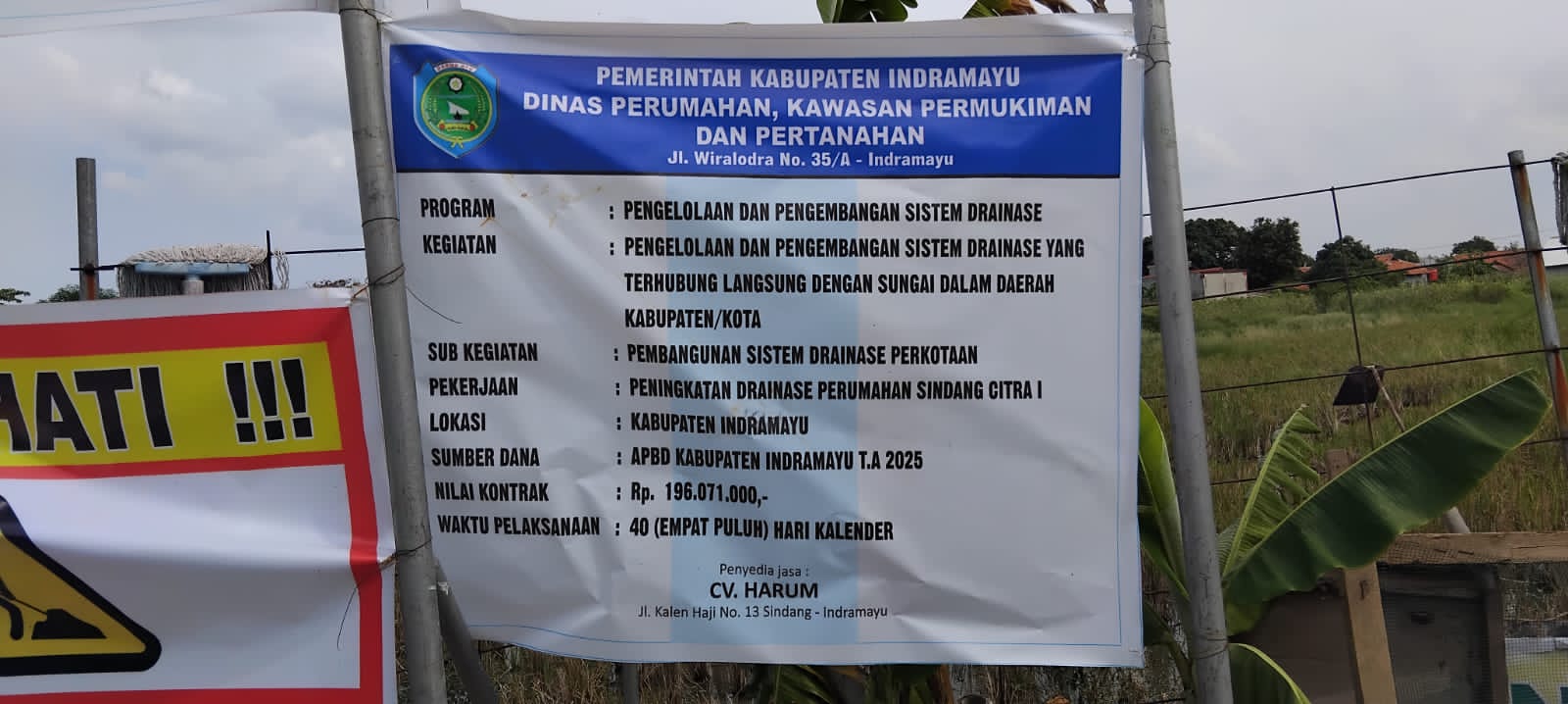 Proyek Pembangunan pengelolaan dan pengembangan sistem Drainase yang terhubung dengan sungai dalam daerah kabupaten atau kota ini dengan anggaran dari Anggaran Pendapatan Belanja Daerah (APBD) Tahun Anggaran 2025 dan dilaksanakan oleh CV. Harum Jl. Kalen Haji No 13 Sindang-Indramayu, dengan nilai kontrak Rp 196.071.000,- Dan waktu pelaksanaannya 40 hari kalender.