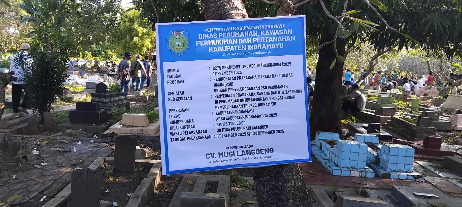 Program peningkatan prasarana, sarana dan utilitas Umum (PSU) dengan sub kegiatan penyediaan sarana dan prasarana serta utilitas Umum dipemakaman untuk menunjang fasilitas umum dengan merehabilitasi pagar TPU, proyek rehabilitasi pagar TPU ini dibiayai dari Anggaran Pendapatan Belanja Daerah (APBD) Tahun Anggaran 2025 dan dilaksanakan oleh penyedia jasa CV. Mugi Langgeng jalan babar layar desa Terusan Kecamatan Sindang Kabupaten Indramayu, dengan nilai kontrak Rp 196.713.000,- Dan waktu pelaksanaannya 30 hari kalender. Dimulai dari tanggal 01 Desember 2025 sampai dengan 30 Desember 2025.