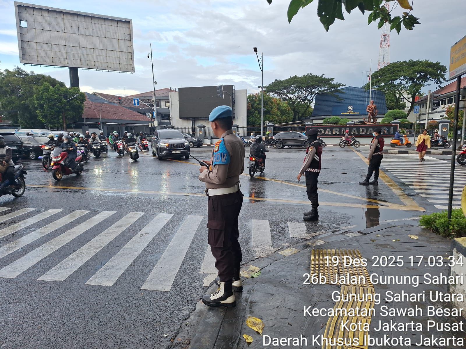 detikhukum.id, || Jakarta Pusat — Dalam cuaca hujan rintik rintik Polsek Sawah Besar menggelar pelayanan publik progresif di sejumlah titik rawan kemacetan, Jumat sore (19/12/2025). Kegiatan ini dilaksanakan sejak pukul 16.00 hingga selesai sebagai upaya pencegahan kecelakaan lalu lintas sekaligus memastikan kelancaran mobilitas warga pengguna jalan yang pulang kerja, Pelayanan dan pencegahan tersebut dipimpin oleh Kanit Patroli Polsek Sawah Besar, Iptu Syafrizal, bersama Aiptu Anwarudin, dan 5 personil lainya di bantu oleh 6 personil Satlantas Polda Metro Jaya.
