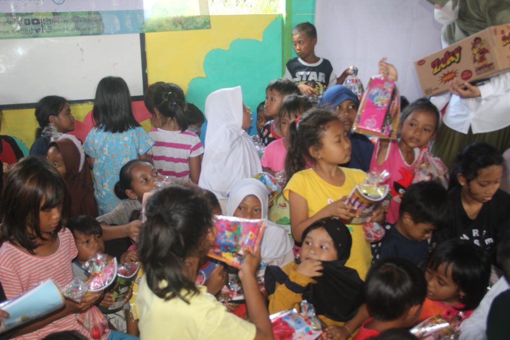 Setelah rangkaian hiburan selesai, panitia membagikan tas sekolah, makanan, snack dan perlengkapan alat mandi kepada seluruh anak yang hadir. Acara ditutup dengan sesi foto bersama sebagai bentuk dokumentasi dan simbol kebersamaan, menandai berakhirnya kegiatan yang berlangsung hangat dan penuh keceriaan.