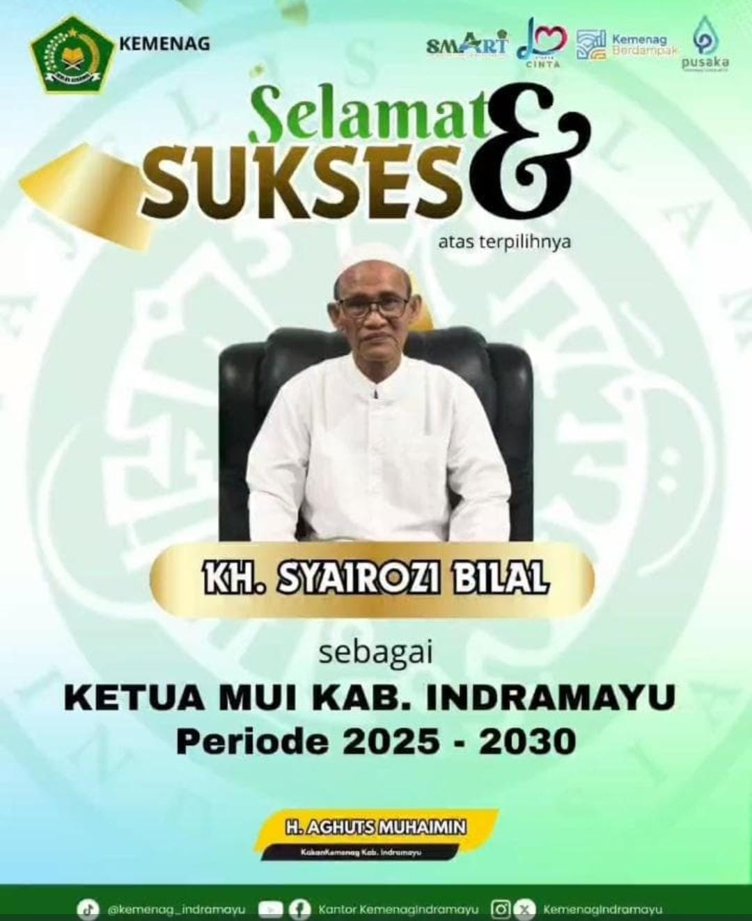 Kepala Kantor Kementerian Agama (Kakan Kemenag) Kabupaten Indramayu Dr. H. Aghuts Muhaimin, S.Pd.I., M.Ag., Mengucapkan selamat dan sukses atas Terpilihnya Kyai Haji (KH) Syairozi Bilal Sebagai Ketua Majlis Ulama Indonesia (MUI) Kabupaten Indramayu untuk periode 2025-2030 pada acara Musda (Musyawarah Daerah) ke-VII yang diselenggarakan di Aula Hotel Trisula jl. Di Panjaitan No.77, Kelurahan Karanganyar, Kecamatan Indramayu, Kabupaten Indramayu, Senin (29/12/2025)