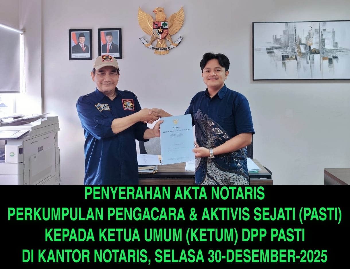 pimpinan tertinggi Pengacara & Aktivis SejaTI (PASTI), yakni RUDY SILFA, SH, MH sebagai Ketua Umum (Ketum) DPP PASTI mendatangi Kantor Notaris di Jakarta Barat, untuk menerima Akta Notaris+SK Menkum RI dan Sertifikat dari Perum Percetakan Negara RI, untuk “Perkumpulan Pengacara & Aktivis SejaTI (PASTI)”.
