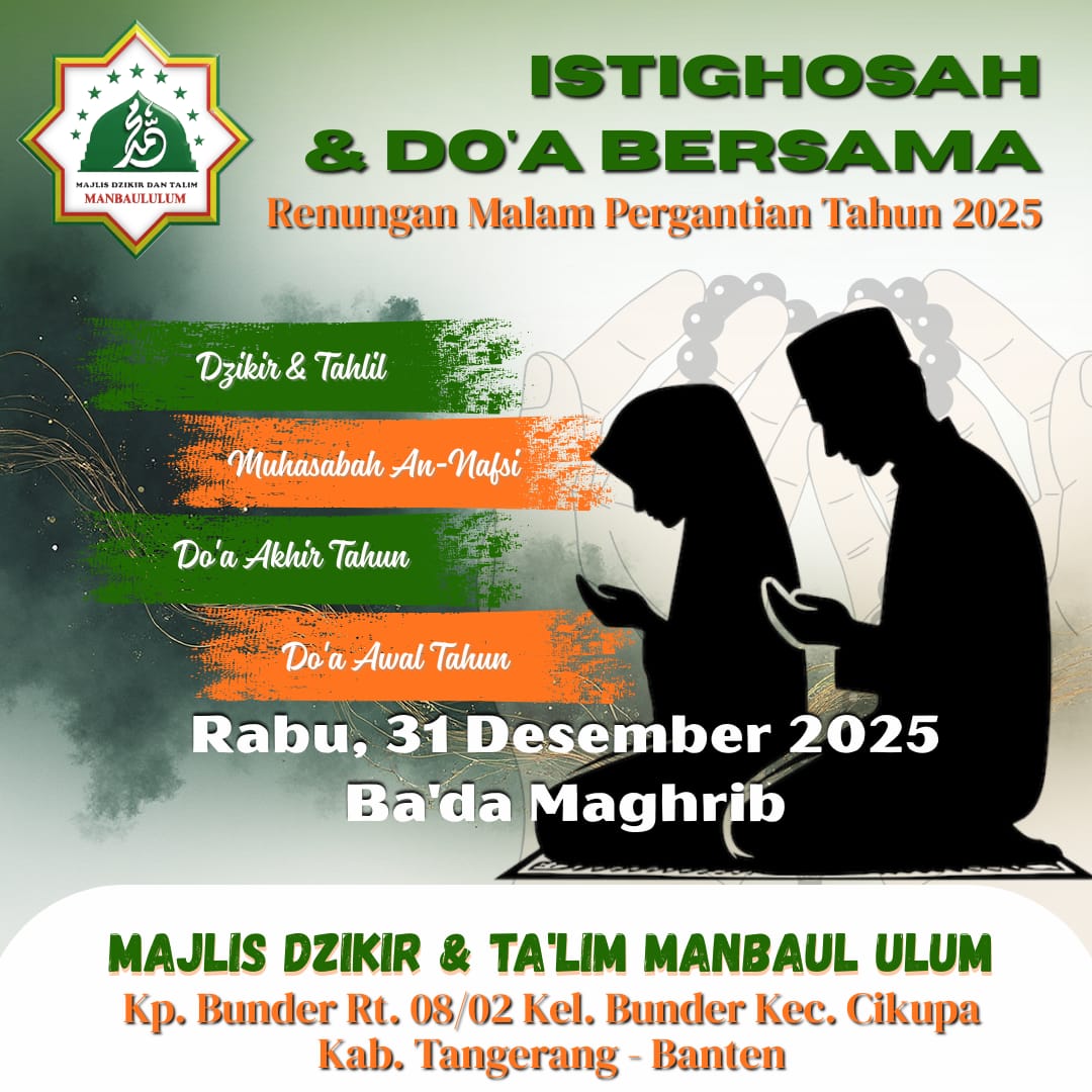 Acara ini bertujuan untuk melepas akhir Tahun 2025 dan menyambut awal Tahun 2026, serta berdo’a untuk kesejahteraan, kedamaian sekaligus untuk saudara-saudara Kita yang tertimpa bencana alam Aceh – Sumatera. Dipimpin langsung oleh Ustad Didin Safrudin, selaku Ketua Rois Syuriah PRNU (Pimpinan Ranting Nahdlatul Ulama) dan sekaligus Pimpinan Majlis Dzikir dan Ta’lim Manbaul Ulum.(31/12/2025)