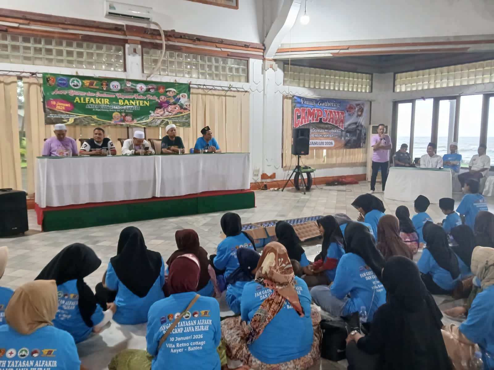 Ustadz Ujang Supriyana menyampaikan. “Assalamualaikum warahmatullahi wabarakatuh, kepada seluruh hadirin yang terhormat, Ketua Acara Haji Fadhil, Bapak Donatur Haji Erick, Ketua Yayasan ALFAKIR Kyai H. Tb Debih Setiawan S.PdI, para perwakilan yayasan dari Pandeglang dan Lebak, sesepuh Camp Java Haji Rusli, perwakilan Forum Wartawan Jaya Indonesia, serta seluruh keluarga besar alumni STM Camp Java dan saudara-saudari yang telah berkumpul di sini hari ini dalam rangkaian acara family gathering dengan tema wisata religi road ke Anyer dan Masjid Agung Banten, sekaligus santunan untuk anak-anak yatim piatu dari Yayasan ALFAKIR Banten.