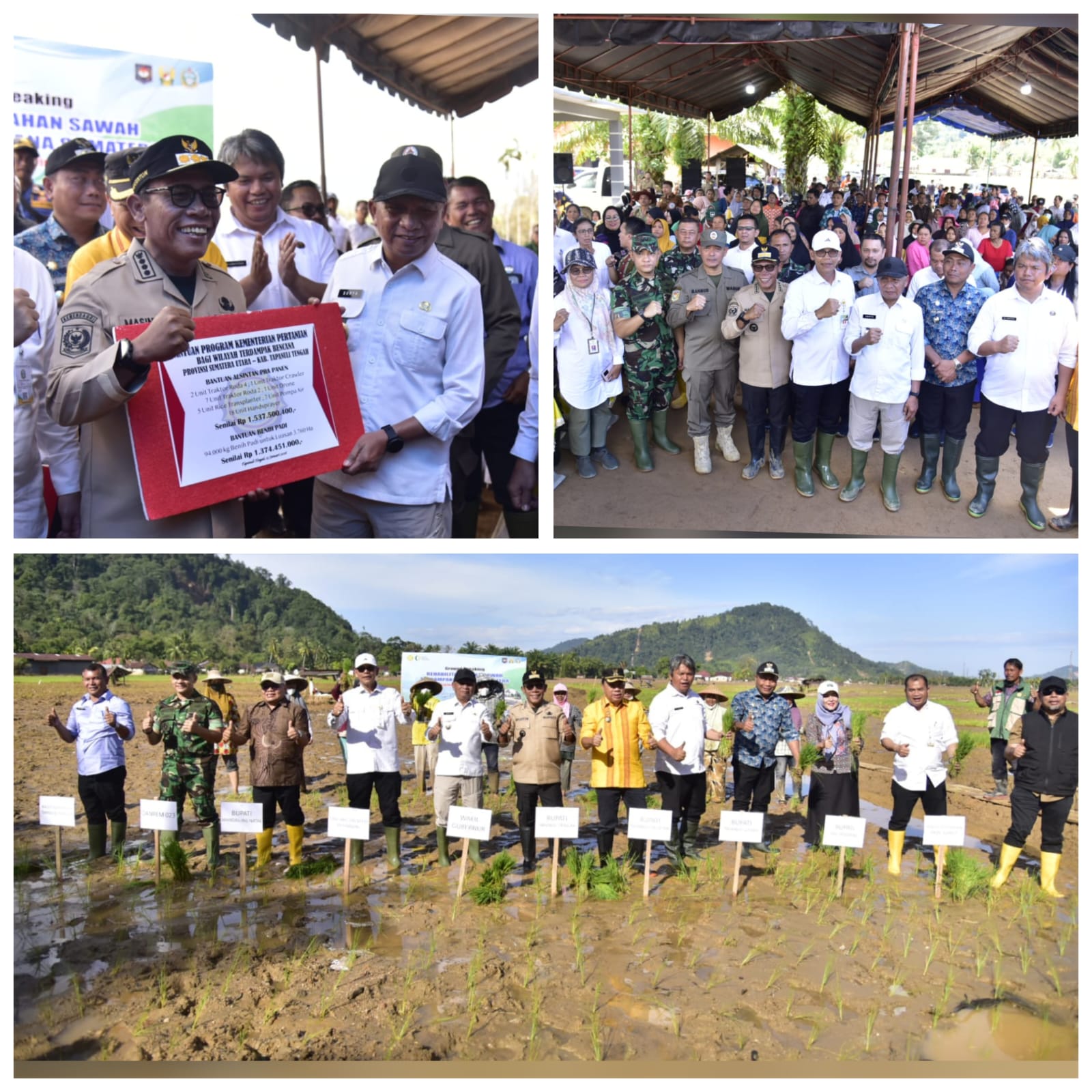 Kegiatan ini dirangkai dengan tanam perdana benih padi dan pemberian bantuan program Kementerian Pertanian bagi wilayah terdampak bencana di Kabupaten Tapteng, berupa bantuan saprodi pupuk dan pestisida, NPK 1.250 kg, urea 750 kg, KCl 500 kg, ⁠Dolomit 10 ton, Kompos 5 ton, Antracol 10 kg, ⁠Karbofuran 100 kg, Pupuk Organik Cair 25 literBantuan Benih (DitjeN TP), Benih Padi Ciherang 7.500 Kg, Alsintan (Dit. Alsin Pra Panen), Traktor Crawler 2 unit Drone 1 unit.Alsintan Pra panen 2 unit traktor roda 4, 1 unit Traktor Crawler, 7 unit traktor roda 2, 1 unit drone, 5 unit Rice Trasplanter, 7 unit pompa air, 18 Henspleyer, senilai Rp 1.537.500.400. Bantuan benih padi 94.000 kg benih padi untuk luasan 3.760 Ha, senilai Rp 1.374.451.000.