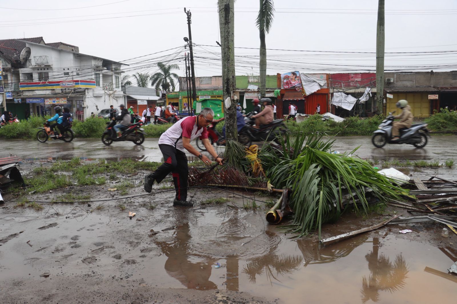 Kegiatan membersihkan material sisa bencana dipimpin Wakapolresta Tangerang Kombes Pol Christian Aer.Polisi bersama warga membersihkan sisa pohon tumbang, dahan patah, serta puing atap rumah dan ruko yang berserakan akibat terjangan angin kencang.