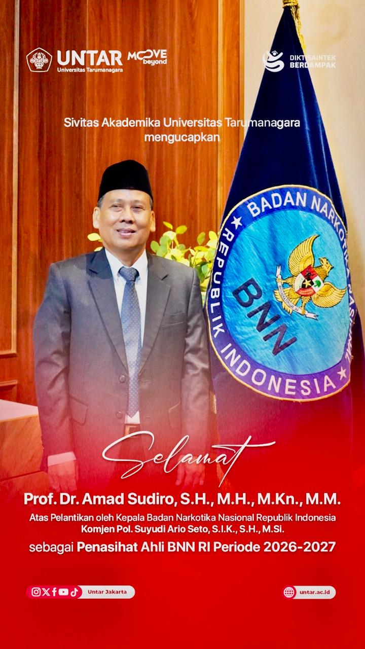 Keluarga Besar (KB) Sivitas Akademika Universitas Tarumanegara (Untar) Jakarta mengucapkan Selamat dan Sukses atas Dilantiknya Prof. Dr. Amad Sudiro, S.H., M.H., M.Kn., M.M sebagai Penasihat Ahli BNN-RI (Badan Narkotika Nasional Republik Indonesia) Periode 2026-2027 yang diselenggarakan di Jl. M.T. Haryono No. 11, Cawang, Kramat Jati Jakarta Timur, Senin (26/01/2026)